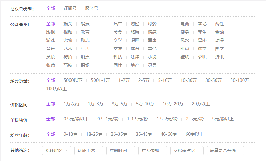 目前市场上已存在不少关于自媒体账号的交易平台。诸如新媒虎、墨禾新媒、鱼爪网等。目前各自媒体账号交易平台,对于的归类、价值影响因素的考虑等基本一致,按类型区分订阅号及服务号,并根据领域的不同,进行更为细分的类目的划分。以“新媒虎”为例来看,按照类目可分为50种,并根据粉丝数量、粉丝年龄等可供筛选。