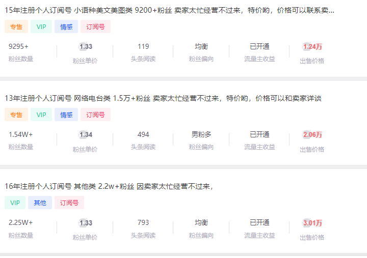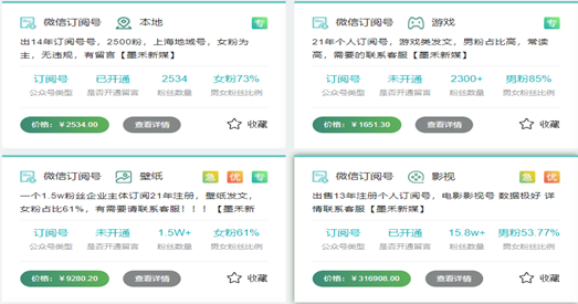 根据平台挂牌交易的情况来看,受类型、粉丝数量、粉丝男女比例、头条阅读量、粉丝地区分布、注册时间等因素的不同,其挂牌交易价格存在明显的差异。
