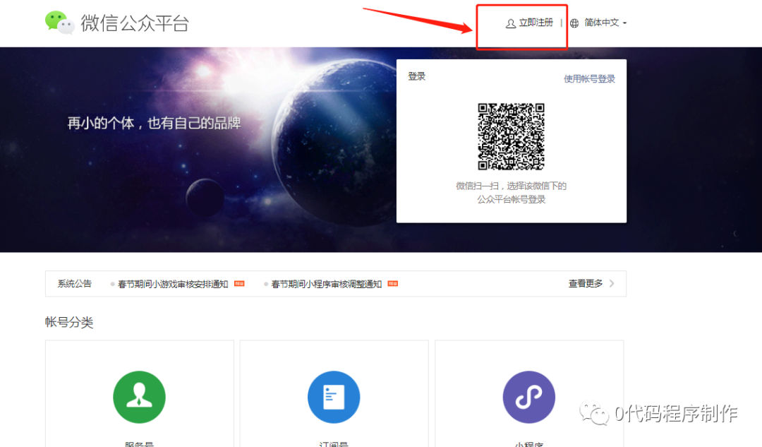 进入微信公共平台,点击立即注册,选择账号注册类型,按要求填写相关信息,完成注册。注册完成后,需要记录小程序注册ID、小程序应用程序密钥等信息。