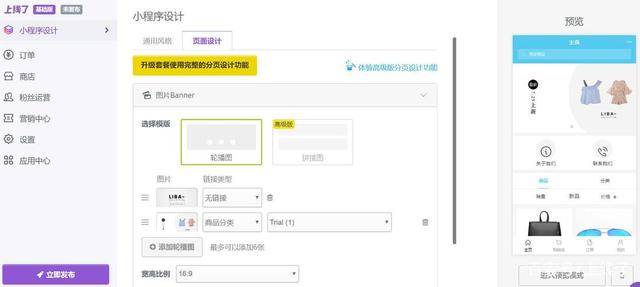 首先,你需要找一个简单的带分销功能的小程序开发工具,比如「上线了」,比较简单,直接选个电商模板(或超级云名片-电商版),再添加需要的功能版块,包括轮播图、拼接图、视频、快捷按钮、标题、品牌馆、商品列表等。在“商品”栏添加新的商品、商品分类,就能快速搭建好小程序。